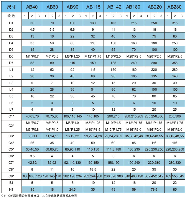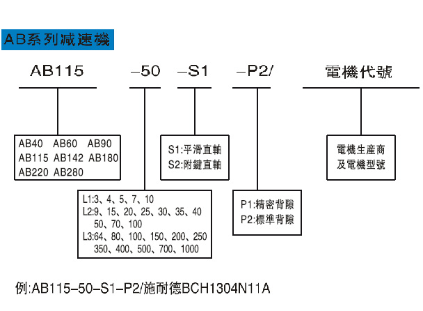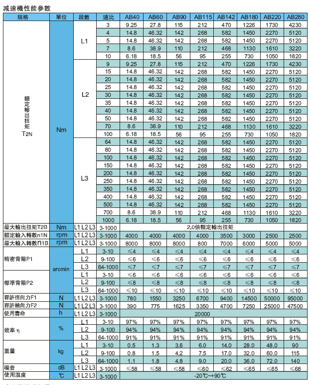 AB系列伺服行星減速器分:AB 40、60、90、115、140、180、220、280同軸式機(jī)座型號(hào),速比:1-1000有20多個(gè)比速可選擇;分一、二、三級(jí)減速傳動(dòng);精度:傳動(dòng)精度在2-4弧分,二級(jí)傳動(dòng)精度在4-5弧分,三級(jí)傳動(dòng)精度6-7弧分;等一千多種規(guī)格。